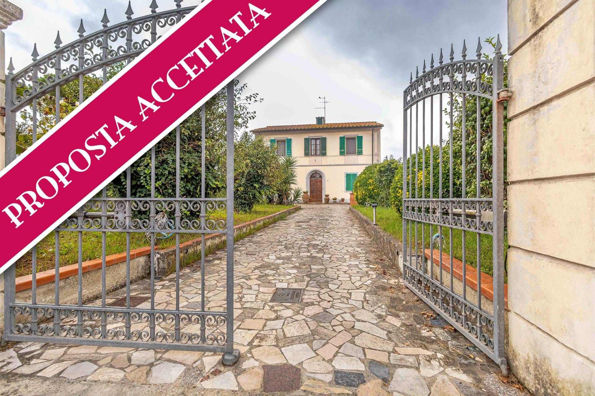 L’accesso alla proprietà avviene da un ampio cancello carrabile automatico: un grazioso vialetto conduce alla scala esterna che porta al piano primo. L'abitazione si apre su un ingresso tradizionale, proseguendo con una sala luminosa, una cucina abitabile con accesso a balcone, due spaziose camere matrimoniali, uno studio e un bagno finestrato con vasca.