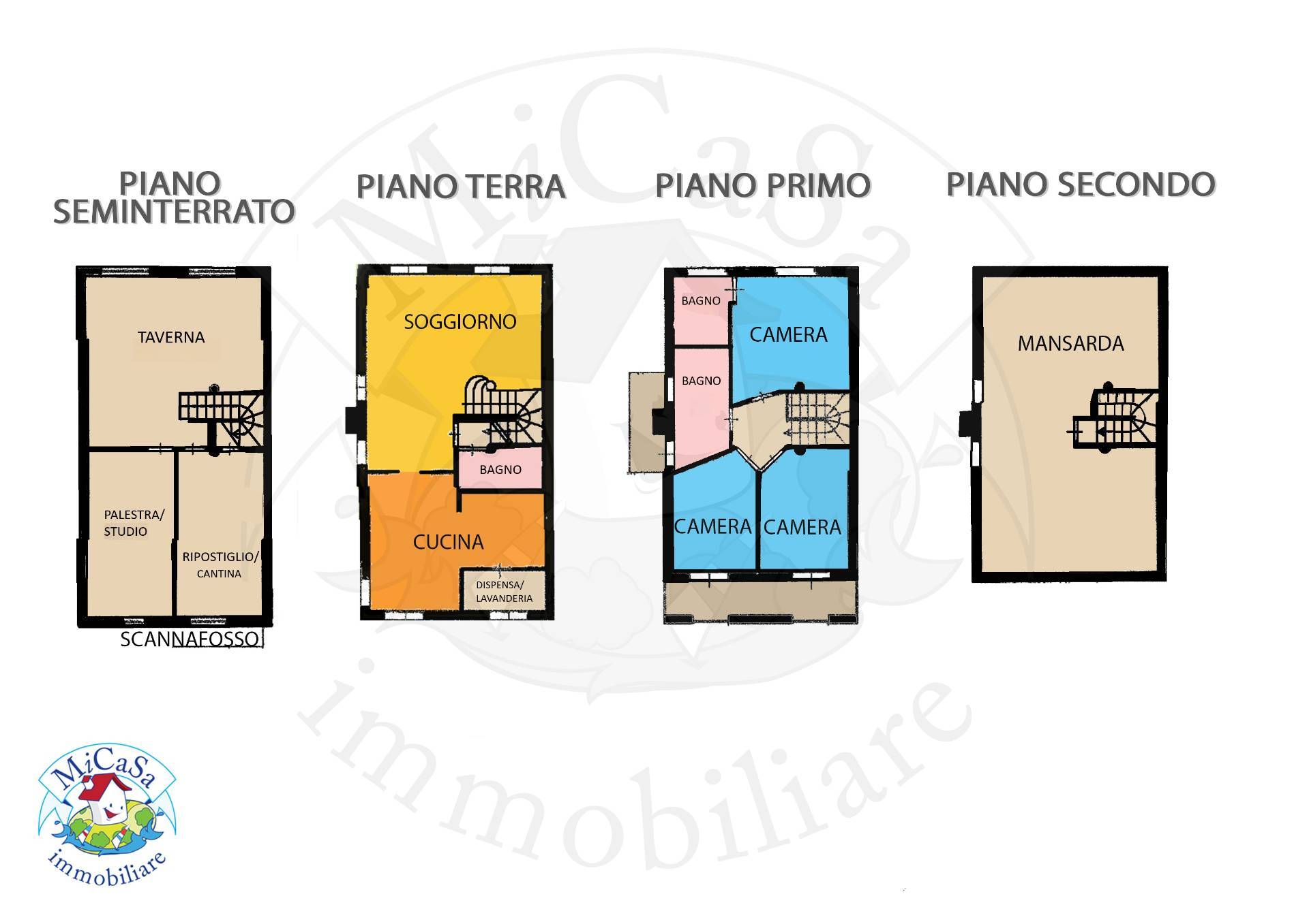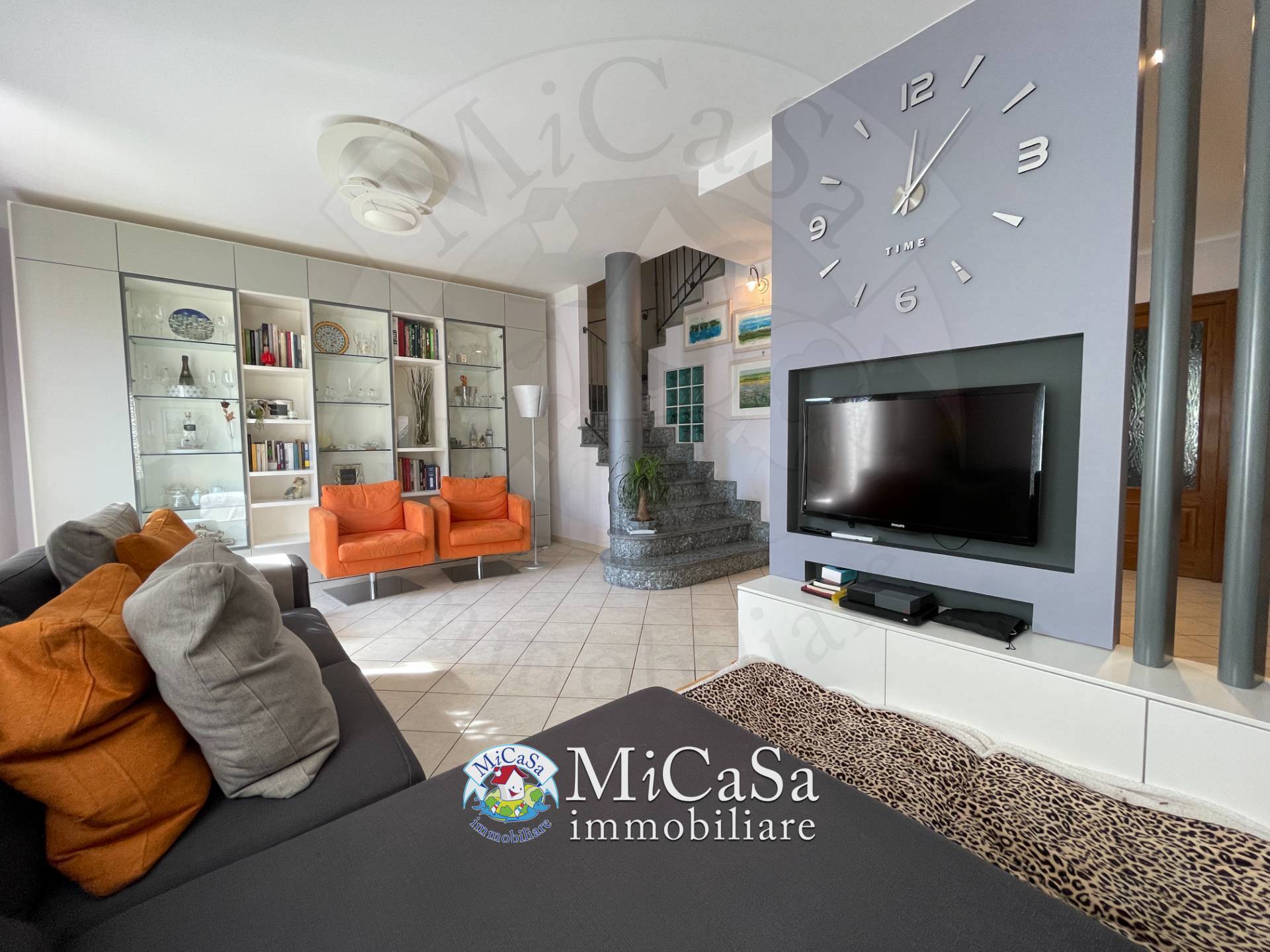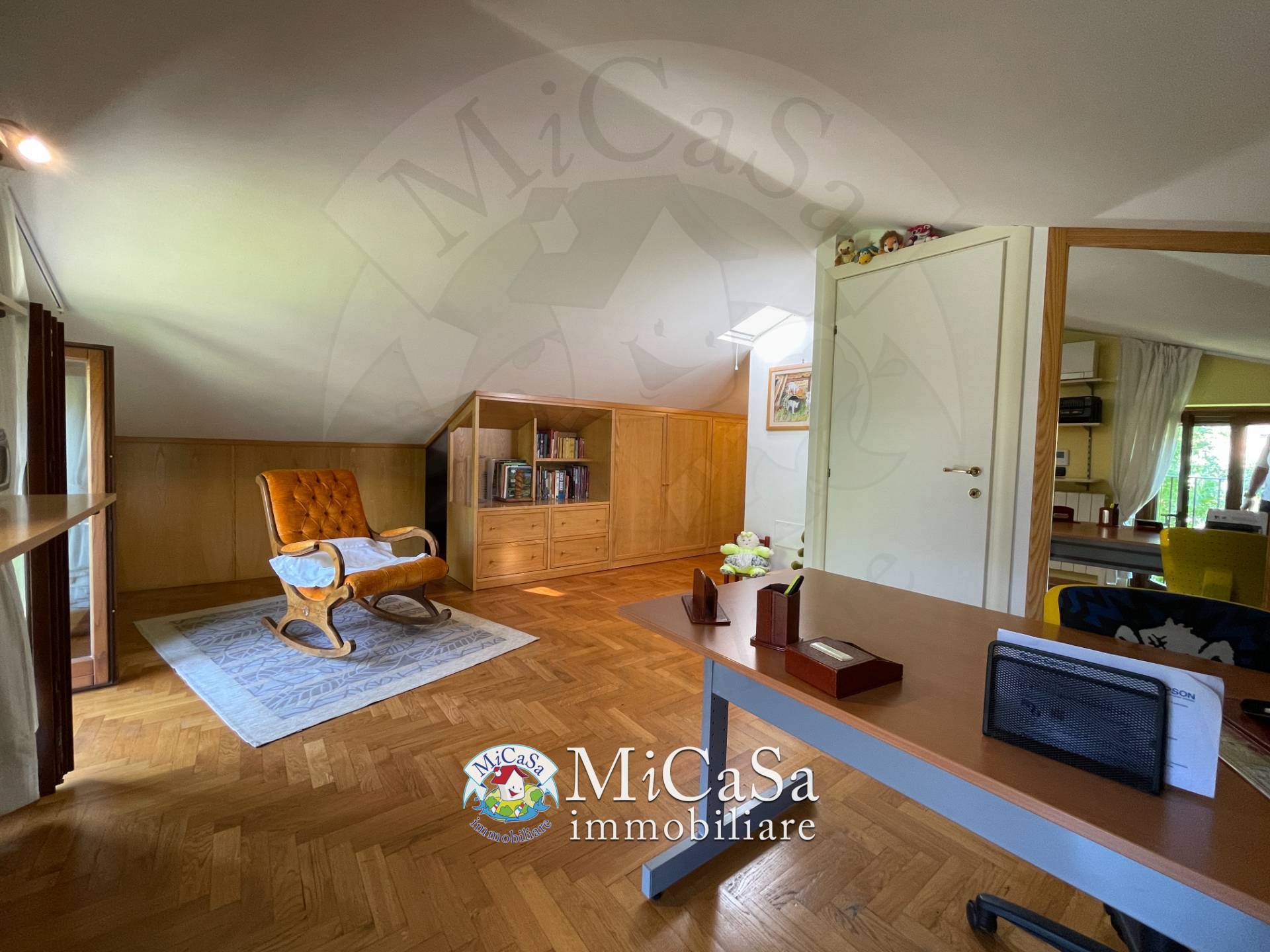 La villa è composta internamente da ampio ingresso, salone, cucina abitabile con ripostiglio/lavanderia e bagno completo di doccia a servizio del piano terra. Scendendo al piano seminterrato troviamo la grande taverna attualmente utilizzata come ulteriore zona giorno dotata anche di cucina completa in finta muratura, oltre a due ulteriori vani utilizzati come palestra/studio e cantina/dispensa. La zona notte al primo piano è composta da tre camere, di cui una adibita a cabina armadi e una matrimoniale con bagno in camera completo di doccia e finestra. Al piano superiore ampia mansarda di mq utile come studio.