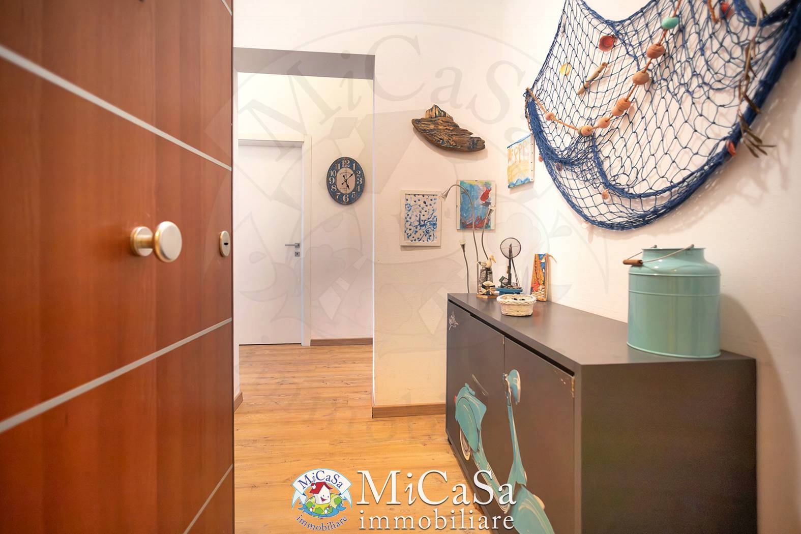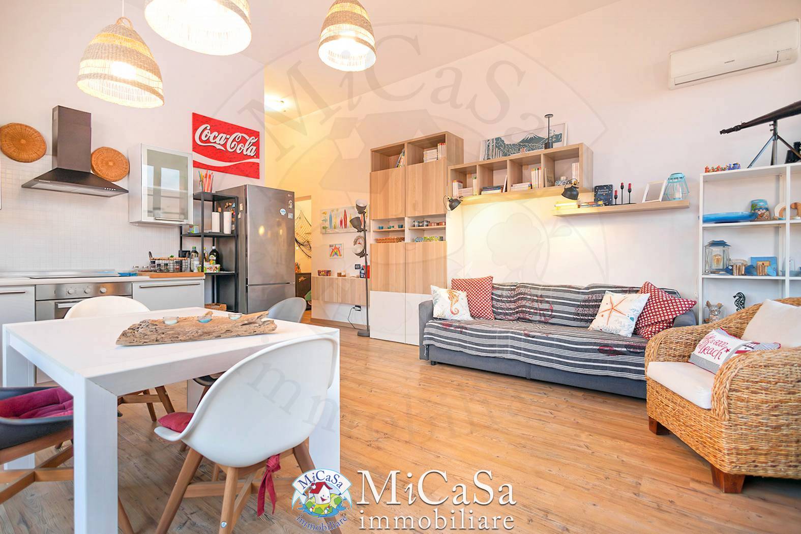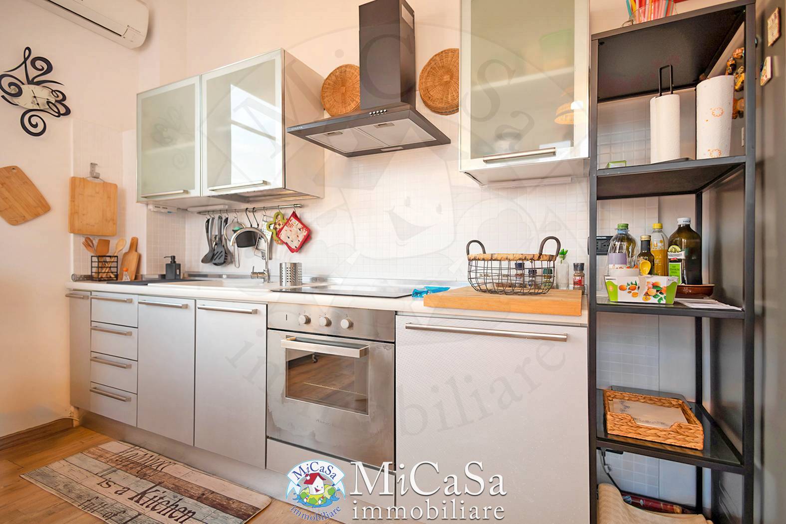 L’immobile, venduto completamente arredato, si compone di ingresso, ampio soggiorno di circa 29 mq con angolo cottura e grandi finestre vista mare, luminosa camera matrimoniale, bagno moderno con box doccia; completano la proprietà un posto auto scoperto.